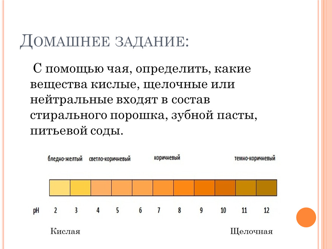 С помощью чая, определить, какие вещества кислые, щелочные или нейтральные входят в состав стирального порошка, зубной пасты, питьевой соды.