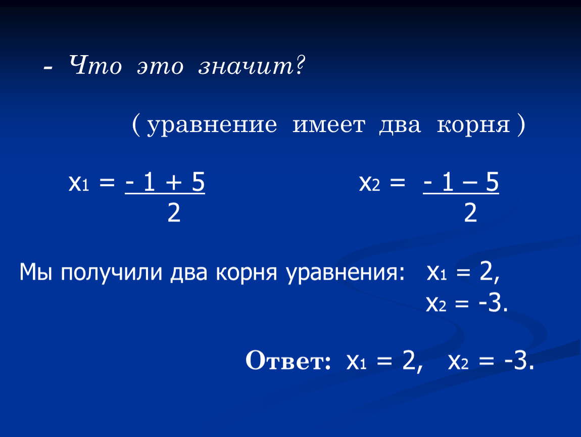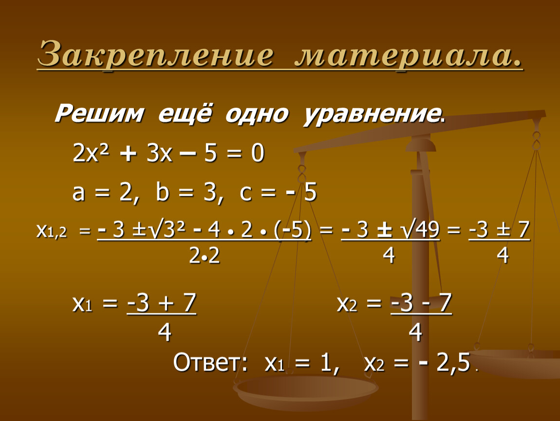 х1,2 = - 3 ±√3² - 4 • 2 • (-5) = - 3 ± √49 = -3 ± 7