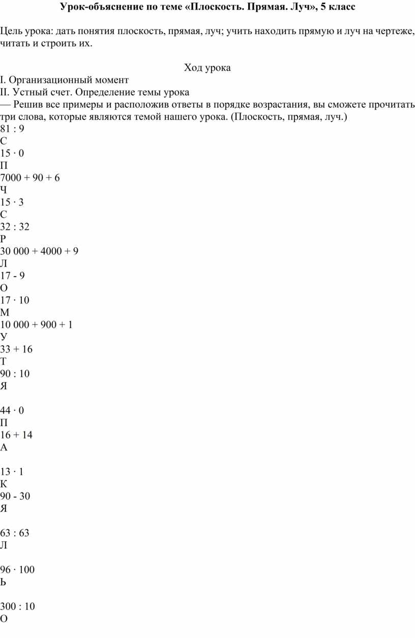 Урок-объяснение по теме «Плоскость. Прямая. Луч», 5 класс