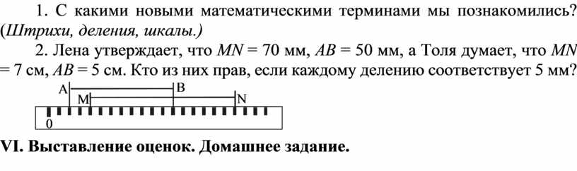 1. С какими новыми математическими терминами мы познакомились? (Штрихи, деления, шкалы.)