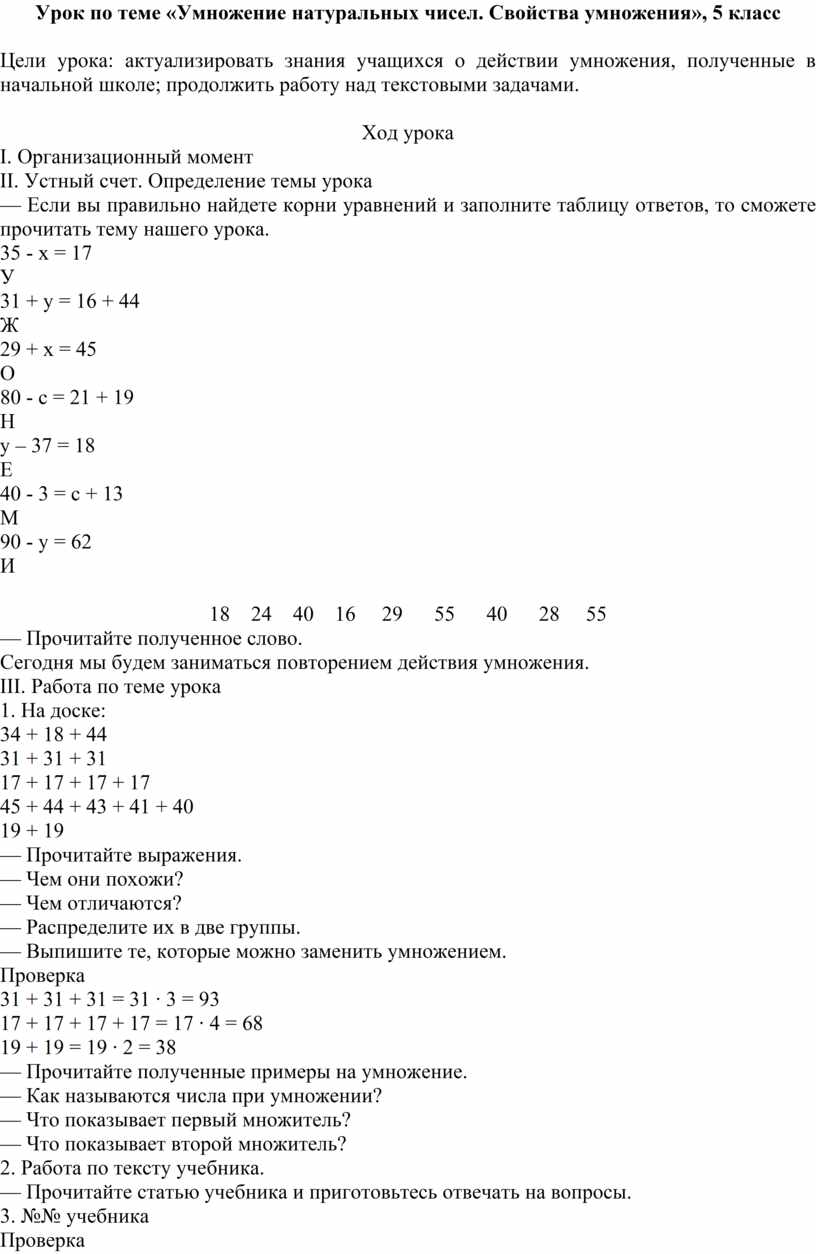 Урок по теме «Умножение натуральных чисел. Свойства умножения», 5 класс