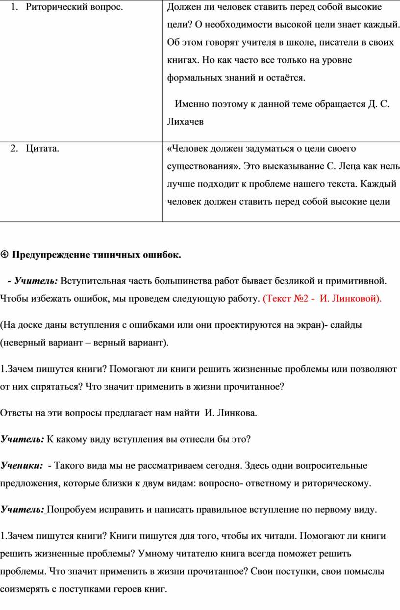 Учитель. Работаем над текстом Д. С. Лихачёва, знакомимся с видами вступлений и работаем над составлением памятки.