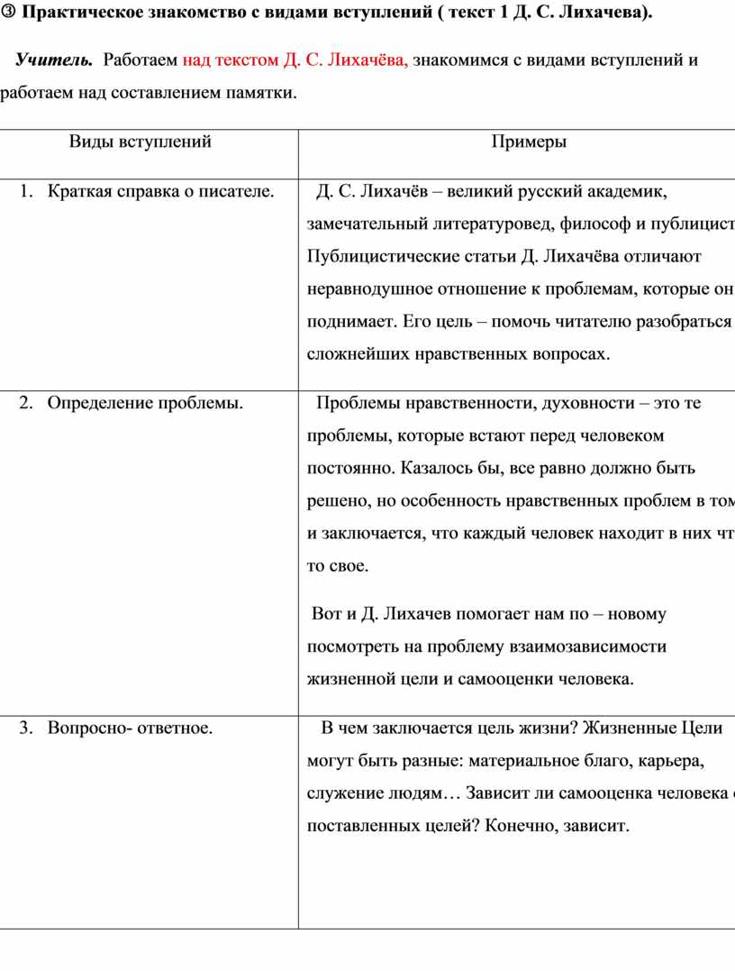 l Практическое знакомство с видами вступлений ( текст 1 Д. С. Лихачева).
