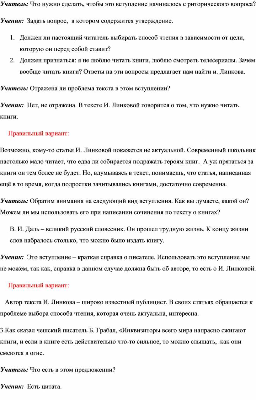 Учитель: Обратим внимания на следующий вид вступления. Как вы думаете, какой он? Можем ли мы использовать его при написании сочинения по тексту о книгах?