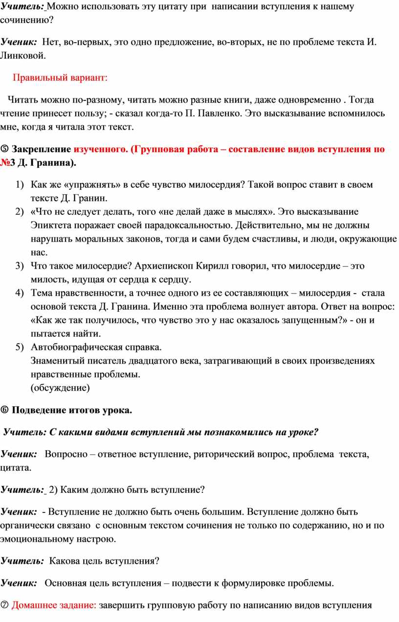 n Закрепление изученного. (Групповая работа – составление видов вступления по №3 Д. Гранина).
