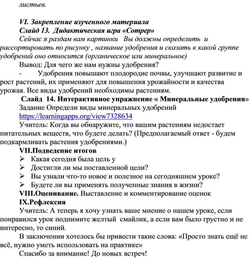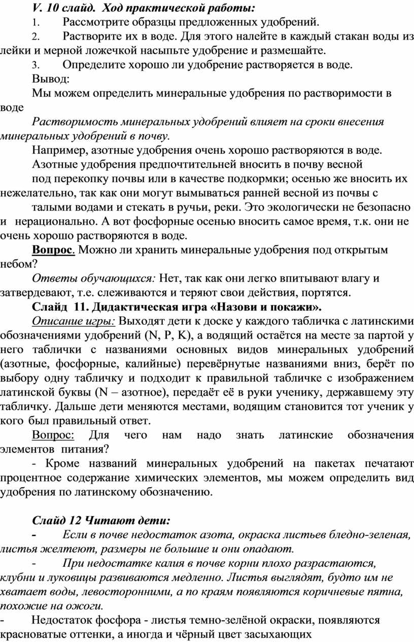 Образовательные: продолжать формировать у обучающихся представление о видах минеральных удобрений и характеристике, дифференцировать понятия «азотные», «фосфорные», «калийные» удобрения. Повторить и закрепить знания об органических удобрениях.