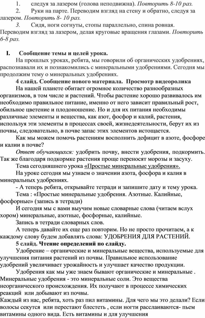 Цель урока: Расширить знания обучающихся о простых минеральных удобрениях их значении для роста и развития растений.