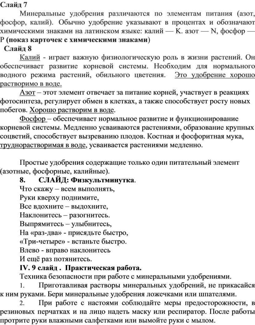 Минеральные удобрения различаются по элементам питания (азот, фосфор, калий). Обычно удобрение указывают в процентах и обозначают химическими знаками на латинском языке: калий — K. азот — N, фосфор — P (показ карточек с химическими знаками)