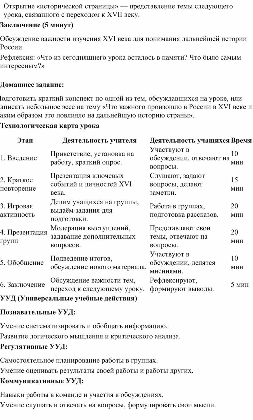 Учащиеся делятся на группы. Каждая группа получает задание подготовить краткий рассказ (3-5 минут) о одной из тем (например, «Реформа царя Ивана IV», «Внешняя политика России», «Культура XVI века»).