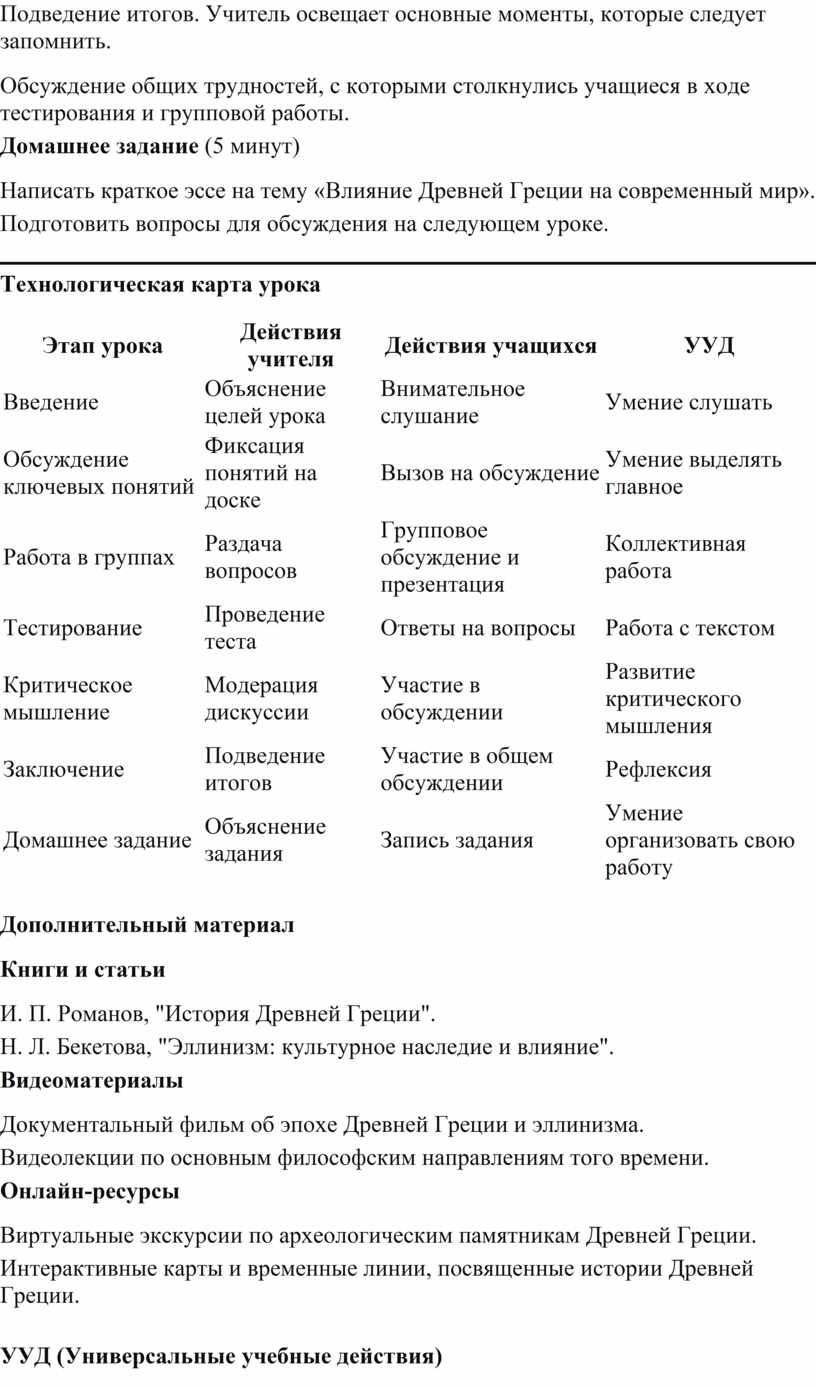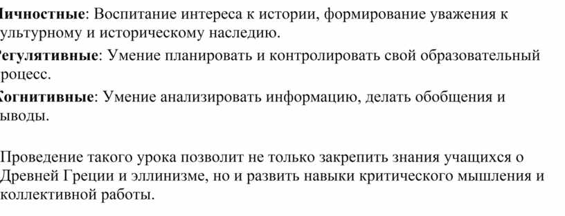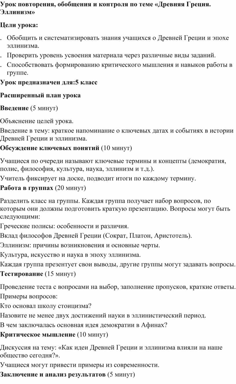 Проведение такого урока позволит не только закрепить знания учащихся о Древней Греции и эллинизме, но и развить навыки критического мышления и коллективной работы.