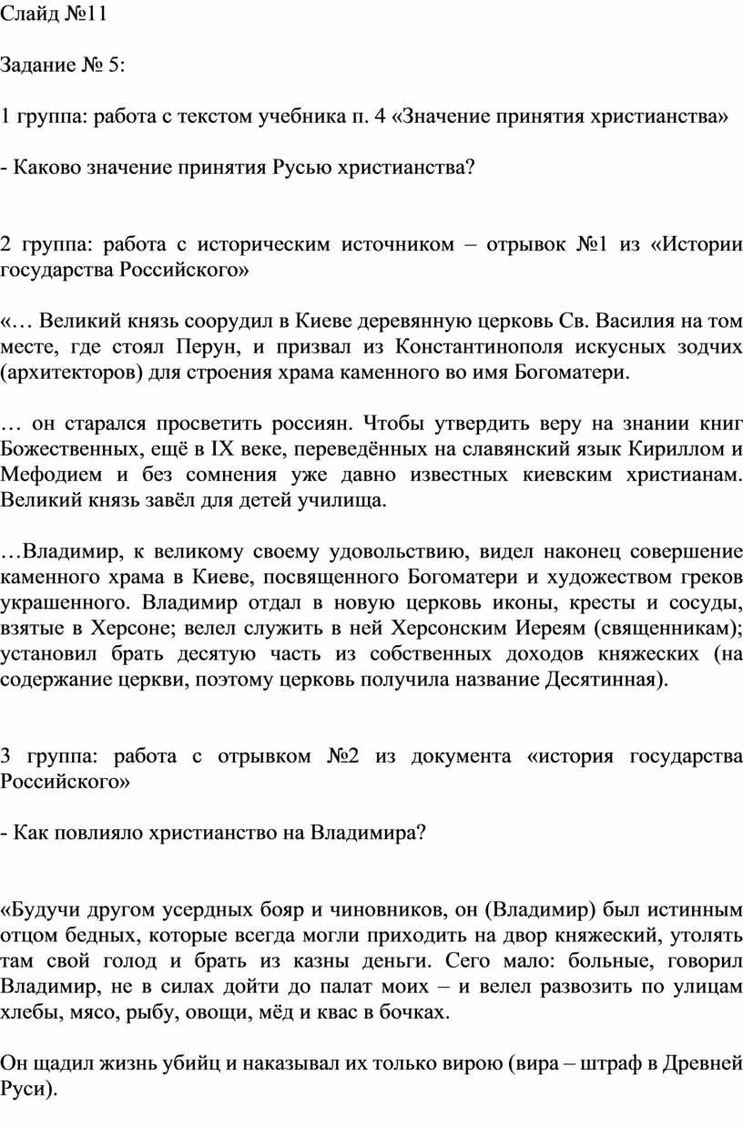 1 группа: работа с текстом учебника п. 4 «Значение принятия христианства»