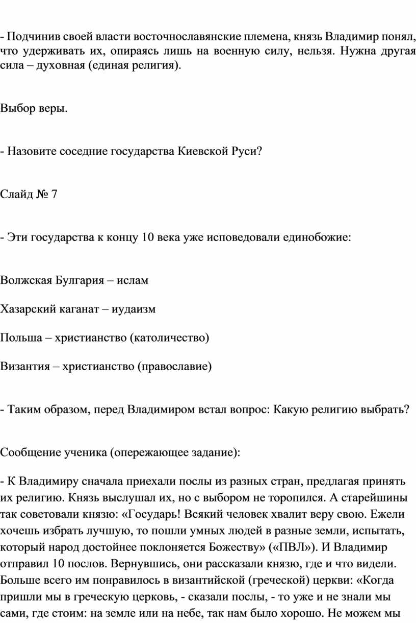 - К Владимиру сначала приехали послы из разных стран, предлагая принять их религию. Князь выслушал их, но с выбором не торопился. А старейшины так советовали князю: «Государь! Всякий человек хвалит веру свою. Ежели хочешь избрать лучшую, то пошли умных людей в разные земли, испытать, который народ достойнее поклоняется Божеству» («ПВЛ»). И Владимир отправил 10 послов. Вернувшись, они рассказали князю, где и что видели. Больше всего им понравилось в византийской (греческой) церкви: «Когда пришли мы в греческую церковь, - сказали послы, - то уже и не знали мы сами, где стоим: на земле или на небе, так нам было хорошо. Не можем мы забыть такой красоты и не хотим другой веры, кроме греческой». А старейшины так сказали князю: «Когда бы закон греческий не был лучше других, то бабка твоя, Ольга, мудрейшая всех людей, не вздумала бы принять его». И великий князь решился быть христианином.