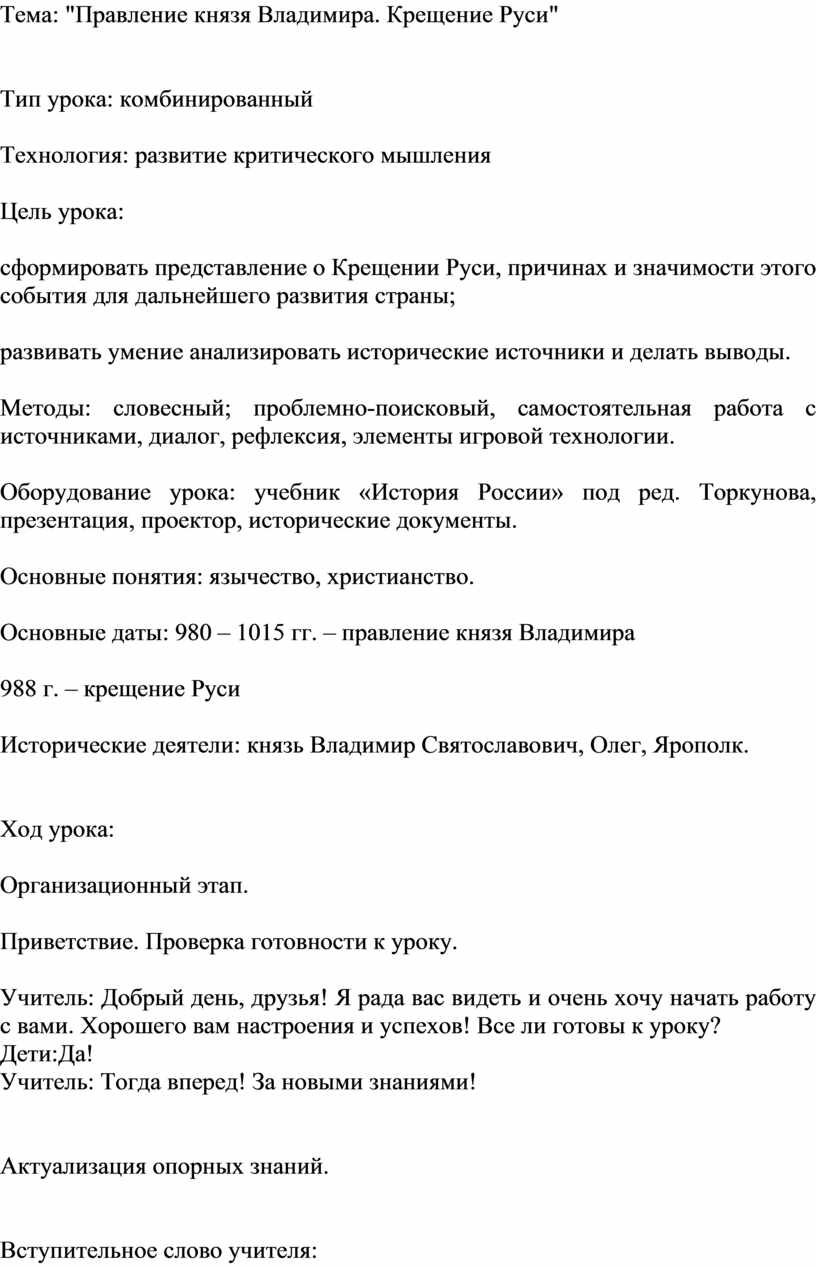 сформировать представление о Крещении Руси, причинах и значимости этого события для дальнейшего развития страны;