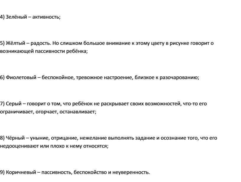 8) Чёрный – уныние, отрицание, нежелание выполнять задание и осознание того, что его недооценивают или плохо к нему относятся;