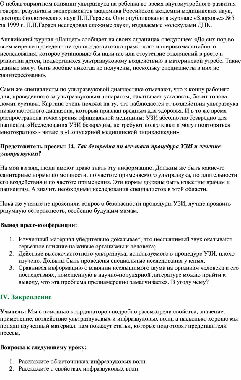 О неблагоприятном влиянии ультразвука на ребенка во время внутриутробного развития говорят результаты экспериментов академика Российской академии медицинских наук, доктора биологических наук П.П.Гаряева. Они опубликованы в журнале «Здоровье» №5 за 1999 г. П.П.Гаряев исследовал сложные звуки, издаваемые молекулами ДНК.