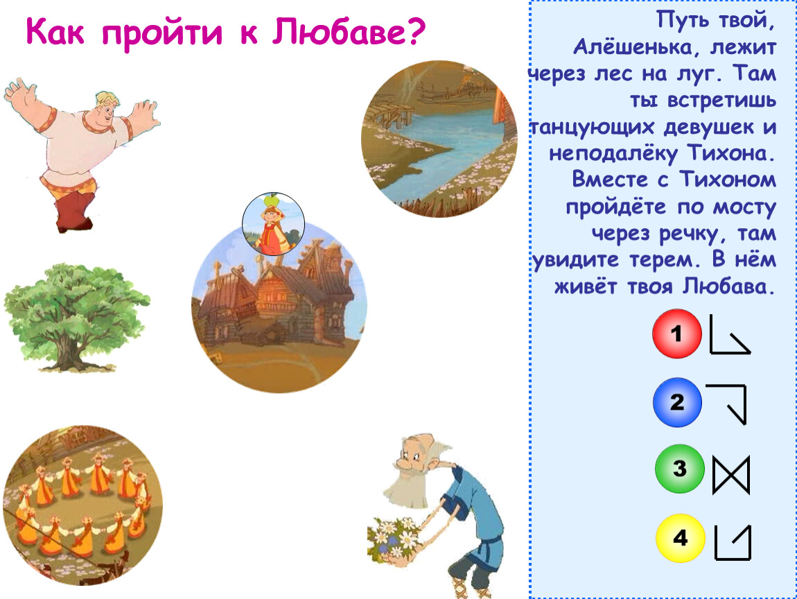 Путь твой, Алёшенька, лежит через лес на луг. Там ты встретишь танцующих девушек и неподалёку Тихона. Вместе с Тихоном пройдёте по мосту через речку, там увидите терем. В нём живёт твоя Любава.
