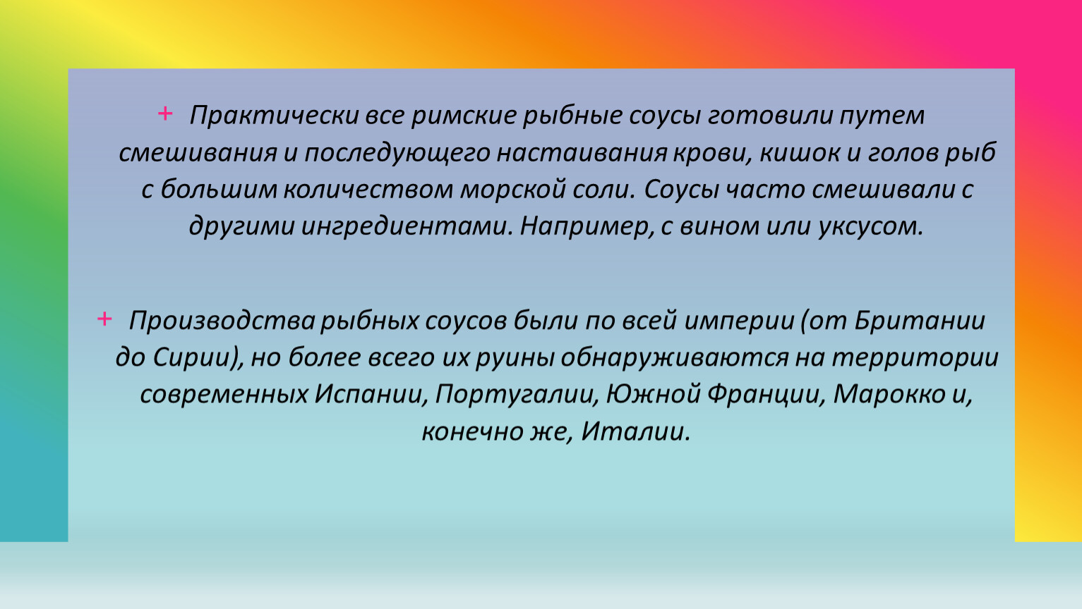 Производства рыбных соусов были по всей империи (от Британии до Сирии), но более всего их руины обнаруживаются на территории современных Испании, Португалии, Южной Франции, Марокко и, конечно же, Италии.