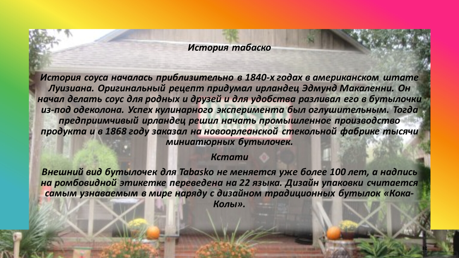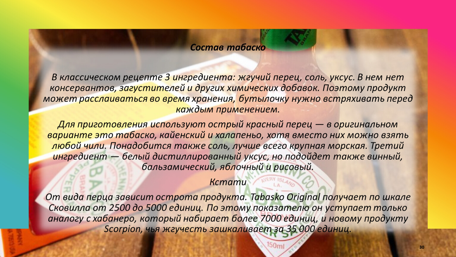 Острый соус табаско известен во всем мире. Эта жгучая приправа придает особый вкус блюдам и входит в состав многих алкогольных коктейлей. Оригинальный соус выпускает американская компания McIlhenny, владелец торговой марки Tabasko. Производят его в Луизиане с 1868 года и продают более чем в 160 странах мира. Рассказываем об истории, видах и полезных свойствах популярной добавки. Можно ли приготовить табаско в домашних условиях и как правильно использовать.
