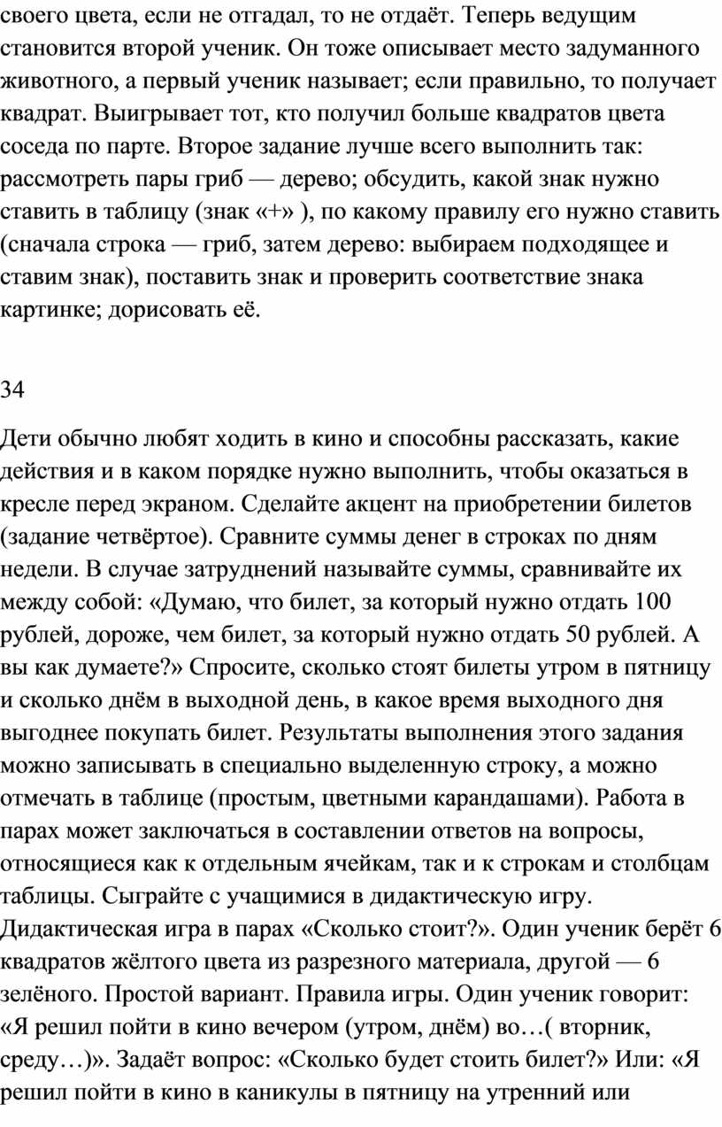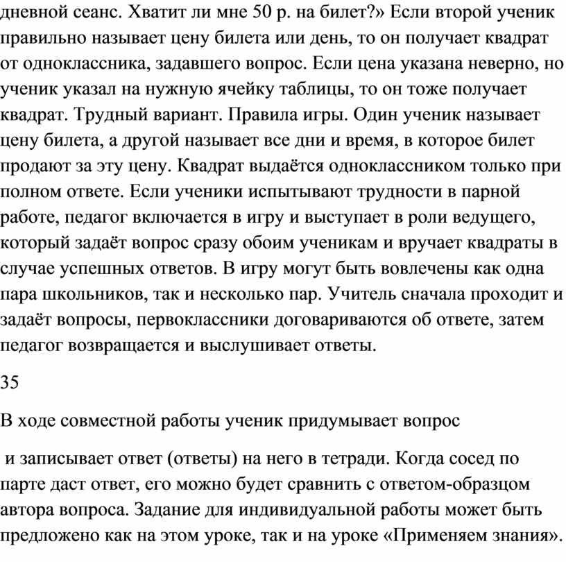 Дети обычно любят ходить в кино и способны рассказать, какие действия и в каком порядке нужно выполнить, чтобы оказаться в кресле перед экраном. Сделайте акцент на приобретении билетов (задание четвёртое). Сравните суммы денег в строках по дням недели. В случае затруднений называйте суммы, сравнивайте их между собой: «Думаю, что билет, за который нужно отдать 100 рублей, дороже, чем билет, за который нужно отдать 50 рублей. А вы как думаете?» Спросите, сколько стоят билеты утром в пятницу и сколько днём в выходной день, в какое время выходного дня выгоднее покупать билет. Результаты выполнения этого задания можно записывать в специально выделенную строку, а можно отмечать в таблице (простым, цветными карандашами). Работа в парах может заключаться в составлении ответов на вопросы, относящиеся как к отдельным ячейкам, так и к строкам и столбцам таблицы. Сыграйте с учащимися в дидактическую игру. Дидактическая игра в парах «Сколько стоит?». Один ученик берёт 6 квадратов жёлтого цвета из разрезного материала, другой — 6 зелёного. Простой вариант. Правила игры. Один ученик говорит: «Я решил пойти в кино вечером (утром, днём) во…( вторник, среду…)». Задаёт вопрос: «Сколько будет стоить билет?» Или: «Я решил пойти в кино в каникулы в пятницу на утренний или дневной сеанс. Хватит ли мне 50 р. на билет?» Если второй ученик правильно называет цену билета или день, то он получает квадрат от одноклассника, задавшего вопрос. Если цена указана неверно, но ученик указал на нужную ячейку таблицы, то он тоже получает квадрат. Трудный вариант. Правила игры. Один ученик называет цену билета, а другой называет все дни и время, в которое билет продают за эту цену. Квадрат выдаётся одноклассником только при полном ответе. Если ученики испытывают трудности в парной работе, педагог включается в игру и выступает в роли ведущего, который задаёт вопрос сразу обоим ученикам и вручает квадраты в случае успешных ответов. В игру могут быть вовлечены как одна пара школьников, так и несколько пар. Учитель сначала проходит и задаёт вопросы, первоклассники договариваются об ответе, затем педагог возвращается и выслушивает ответы.