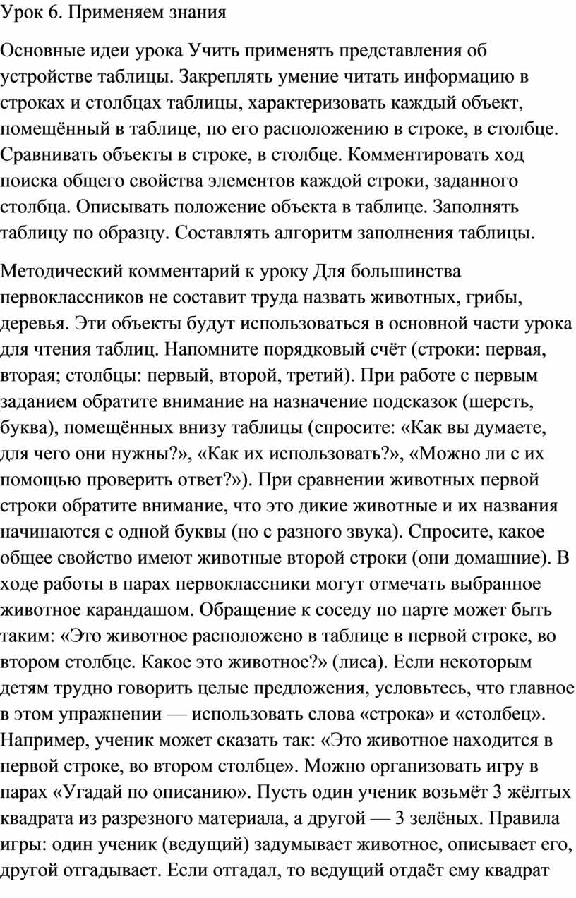Методический комментарий к уроку Для большинства первоклассников не составит труда назвать животных, грибы, деревья. Эти объекты будут использоваться в основной части урока для чтения таблиц. Напомните порядковый счёт (строки: первая, вторая; столбцы: первый, второй, третий). При работе с первым заданием обратите внимание на назначение подсказок (шерсть, буква), помещённых внизу таблицы (спросите: «Как вы думаете, для чего они нужны?», «Как их использовать?», «Можно ли с их помощью проверить ответ?»). При сравнении животных первой строки обратите внимание, что это дикие животные и их названия начинаются с одной буквы (но с разного звука). Спросите, какое общее свойство имеют животные второй строки (они домашние). В ходе работы в парах первоклассники могут отмечать выбранное животное карандашом. Обращение к соседу по парте может быть таким: «Это животное расположено в таблице в первой строке, во втором столбце. Какое это животное?» (лиса). Если некоторым детям трудно говорить целые предложения, условьтесь, что главное в этом упражнении — использовать слова «строка» и «столбец». Например, ученик может сказать так: «Это животное находится в первой строке, во втором столбце». Можно организовать игру в парах «Угадай по описанию». Пусть один ученик возьмёт 3 жёлтых квадрата из разрезного материала, а другой — 3 зелёных. Правила игры: один ученик (ведущий) задумывает животное, описывает его, другой отгадывает. Если отгадал, то ведущий отдаёт ему квадрат своего цвета, если не отгадал, то не отдаёт. Теперь ведущим становится второй ученик. Он тоже описывает место задуманного животного, а первый ученик называет; если правильно, то получает квадрат. Выигрывает тот, кто получил больше квадратов цвета соседа по парте. Второе задание лучше всего выполнить так: рассмотреть пары гриб — дерево; обсудить, какой знак нужно ставить в таблицу (знак «+» ), по какому правилу его нужно ставить (сначала строка — гриб, затем дерево: выбираем подходящее и ставим знак), поставить знак и проверить соответствие знака картинке; дорисовать её.