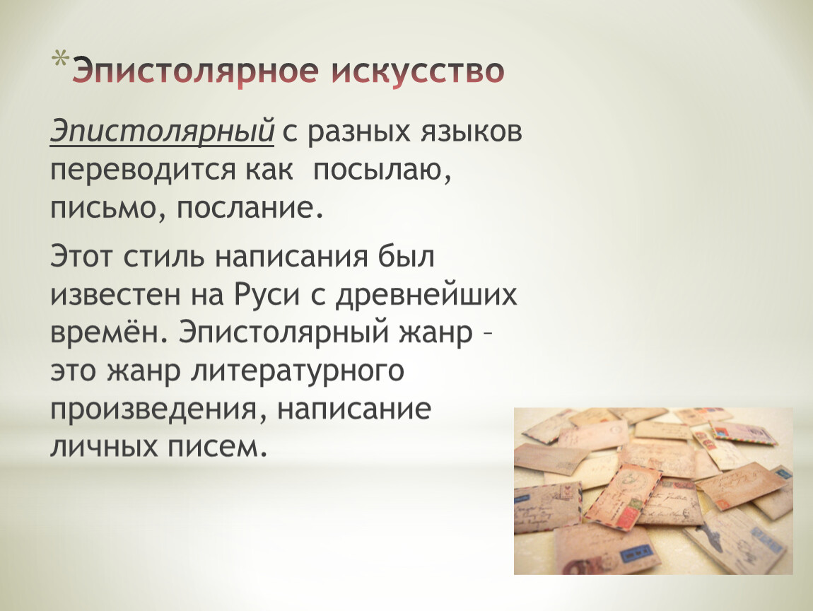 Этот стиль написания был известен на Руси с древнейших времён. Эпистолярный жанр – это жанр литературного произведения, написание личных писем.