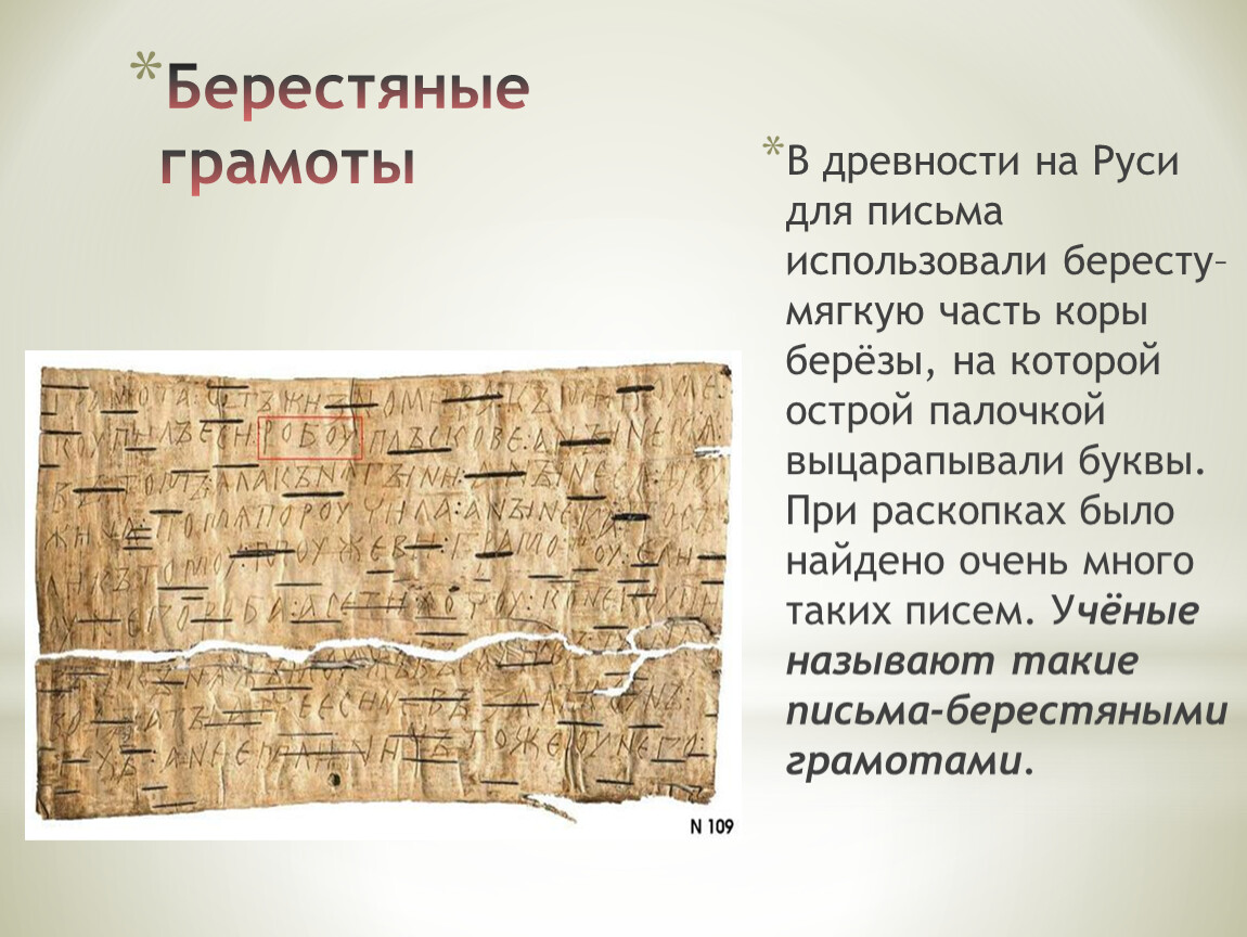 В древности на Руси для письма использовали бересту– мягкую часть коры берёзы, на которой острой палочкой выцарапывали буквы. При раскопках было найдено очень много таких писем. Учёные называют такие письма-берестяными грамотами.