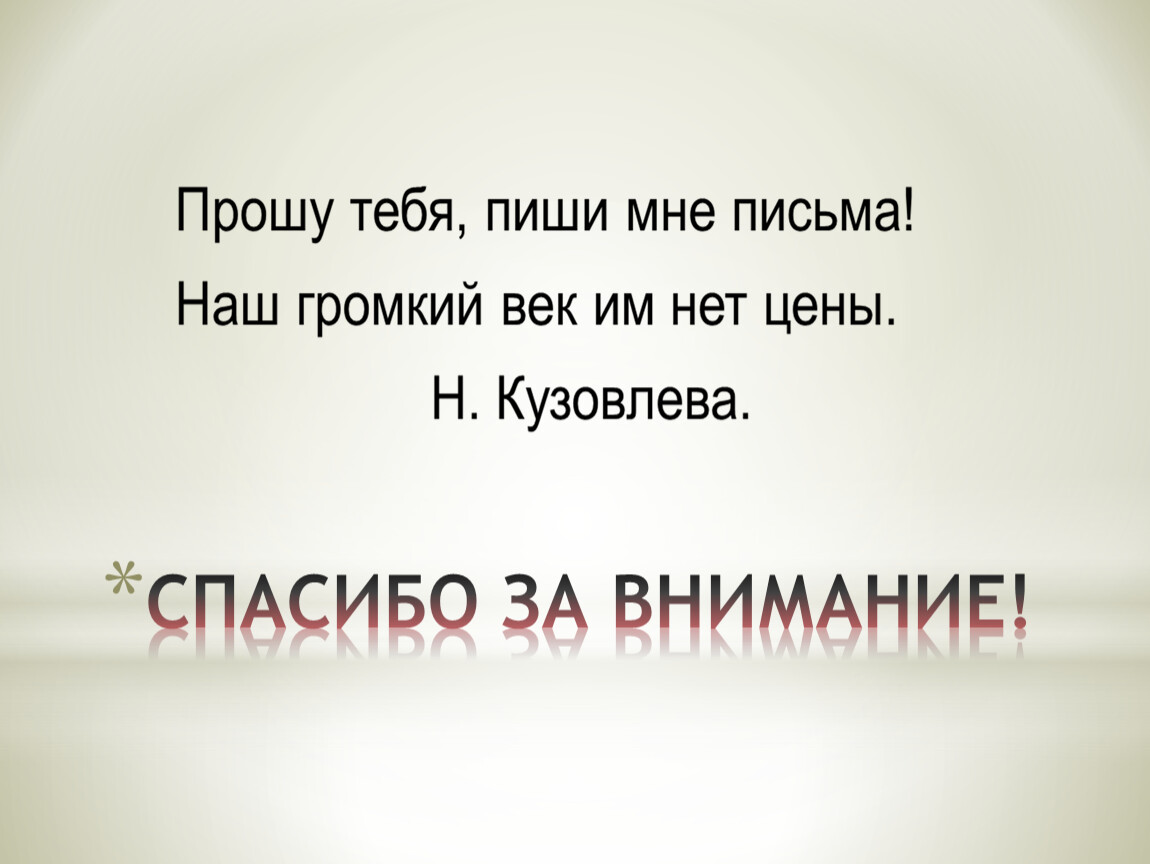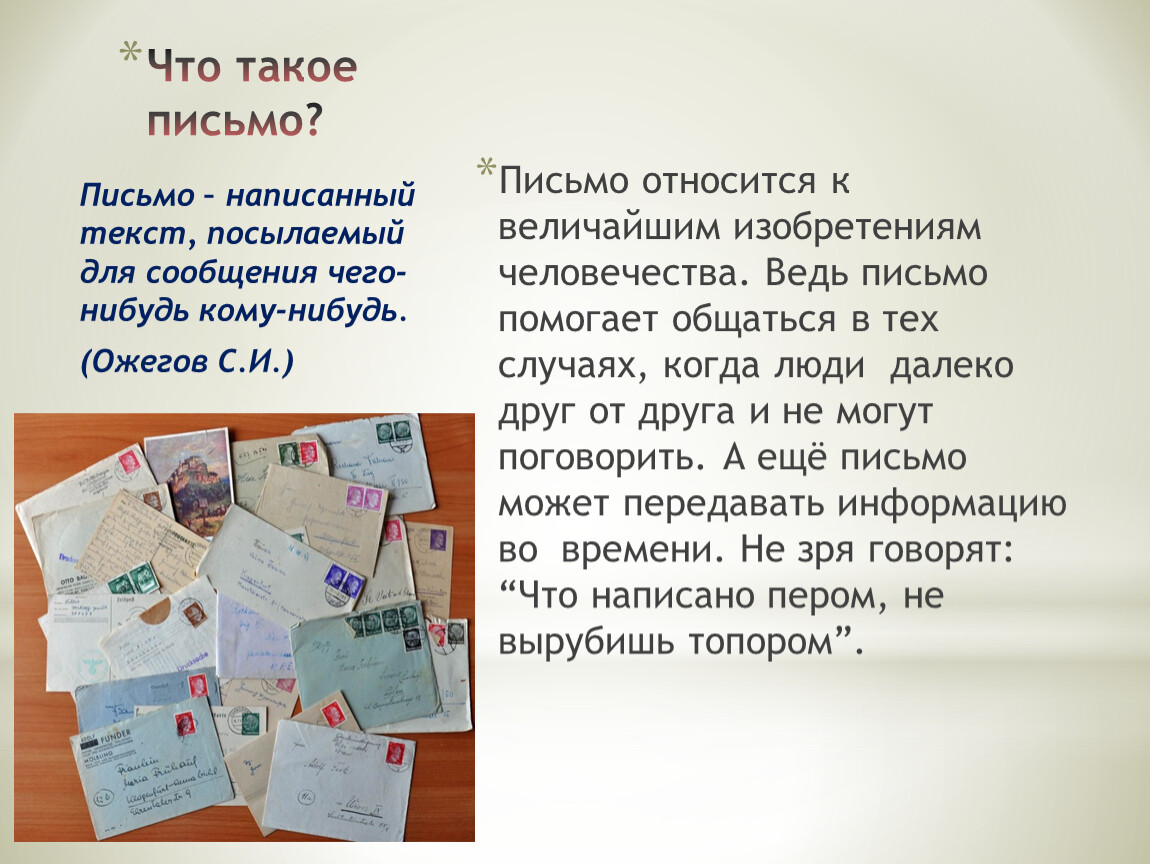 Письмо – написанный текст, посылаемый для сообщения чего-нибудь кому-нибудь.