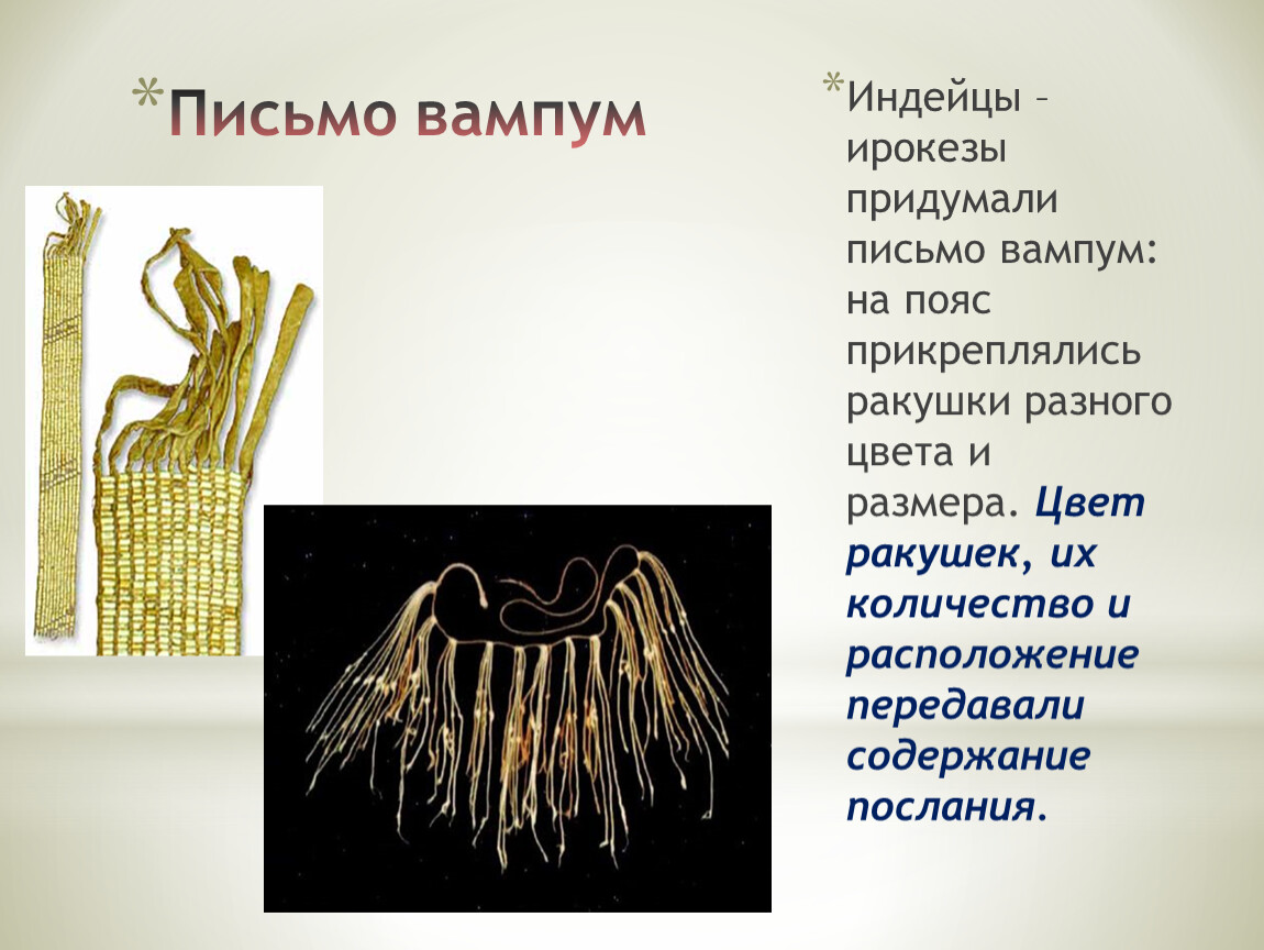 Индейцы – ирокезы придумали письмо вампум: на пояс прикреплялись ракушки разного цвета и размера. Цвет ракушек, их количество и расположение передавали содержание послания.