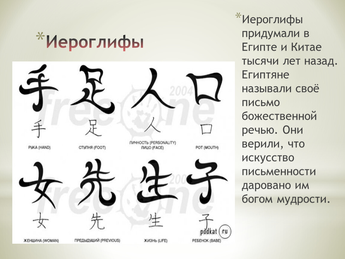 Иероглифы придумали в Египте и Китае тысячи лет назад. Египтяне называли своё письмо божественной речью. Они верили, что искусство письменности даровано им богом мудрости.