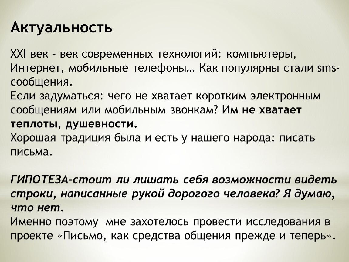 Тема проекта: «Письмо как средство общения прежде и теперь»