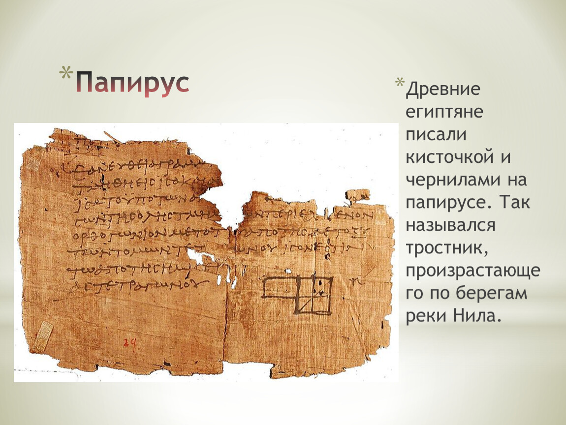 Древние египтяне писали кисточкой и чернилами на папирусе. Так назывался тростник, произрастающего по берегам реки Нила.
