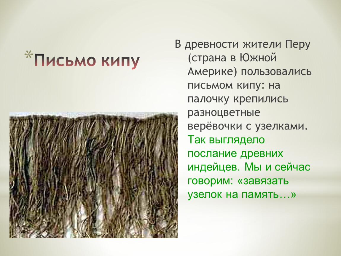 В древности жители Перу (страна в Южной Америке) пользовались письмом кипу: на палочку крепились разноцветные верёвочки с узелками. Так выглядело послание древних индейцев. Мы и сейчас говорим: «завязать узелок на память…»