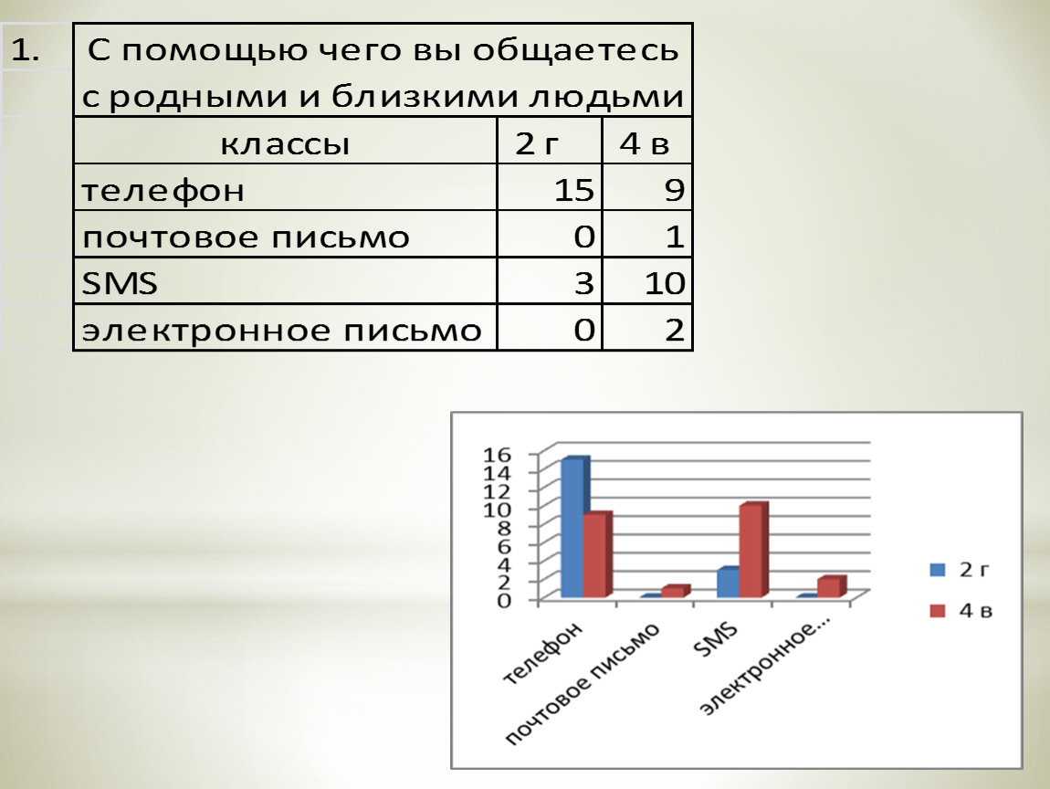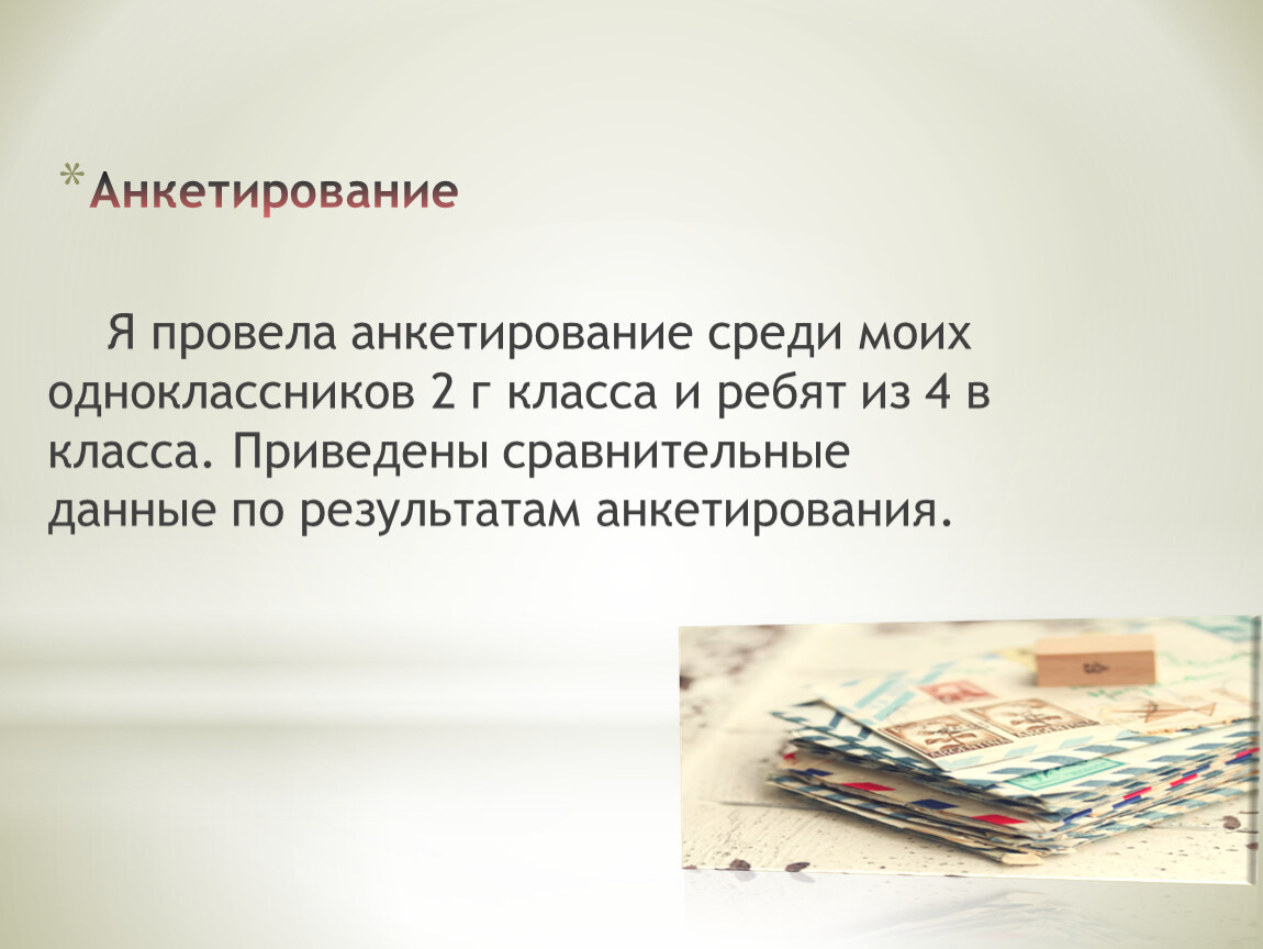 Я провела анкетирование среди моих одноклассников 2 г класса и ребят из 4 в класса. Приведены сравнительные данные по результатам анкетирования.