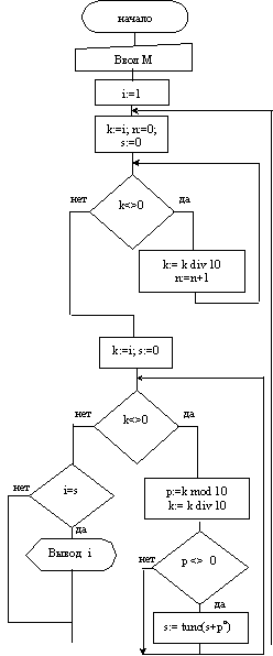 PROGRAM Primer_1; var i,k,s,p,n: Integer; BEGIN Write('Введите M '); Readln(m); For i:=1 to M do begin s:=0; k:=i; n:=0; While k<>0 do begin k:=k DIV 10; n:=n+1 end; k:=i; While k<>0 do begin p:=k MOD 10; k:=k DIV 10; If p<>0 then s:=Trunc (s+Exp(n*Ln(p))) end; If s=f then WriteLn (f) end; END.