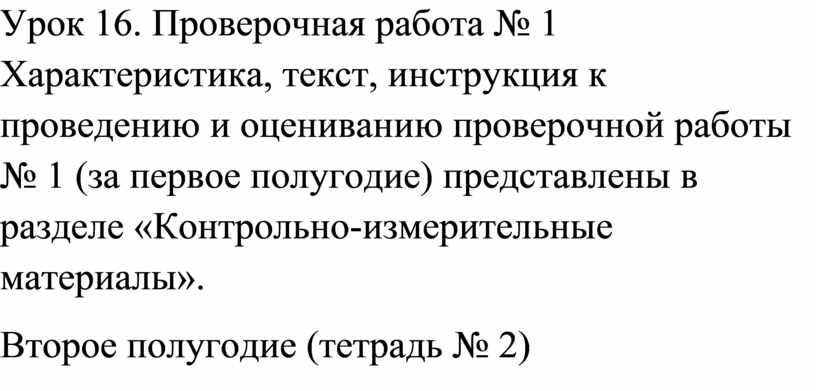 Урок 16. Проверочная работа № 1 Характеристика, текст, инструкция к проведению и оцениванию проверочной работы № 1 (за первое полугодие) представлены в разделе «Контрольно-измерительные материалы».