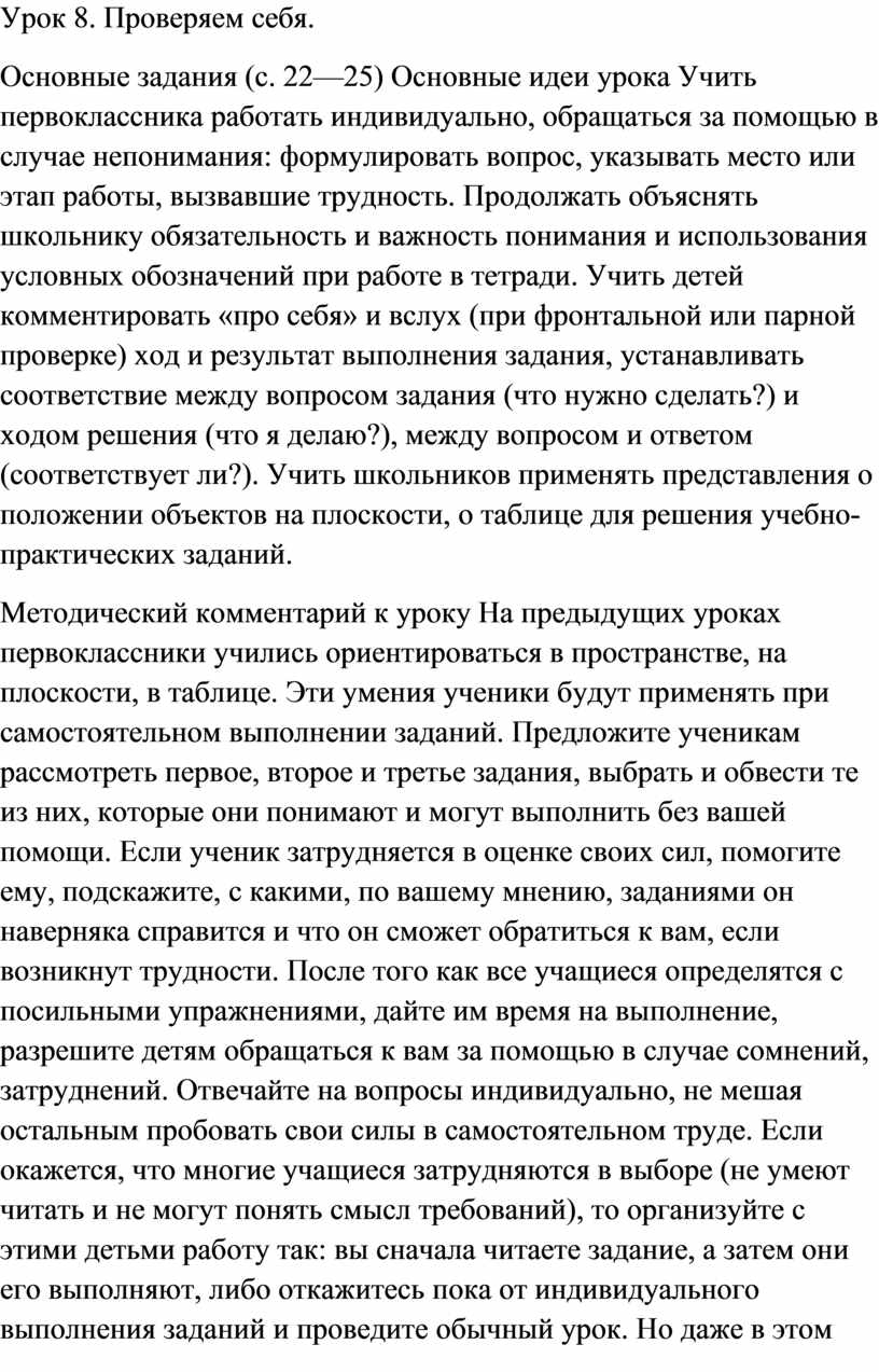 Основные задания (с. 22—25) Основные идеи урока Учить первоклассника работать индивидуально, обращаться за помощью в случае непонимания: формулировать вопрос, указывать место или этап работы, вызвавшие трудность. Продолжать объяснять школьнику обязательность и важность понимания и использования условных обозначений при работе в тетради. Учить детей комментировать «про себя» и вслух (при фронтальной или парной проверке) ход и результат выполнения задания, устанавливать соответствие между вопросом задания (что нужно сделать?) и ходом решения (что я делаю?), между вопросом и ответом (соответствует ли?). Учить школьников применять представления о положении объектов на плоскости, о таблице для решения учебно-практических заданий.