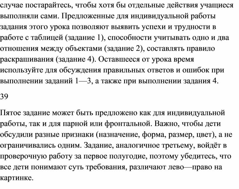 Методический комментарий к уроку На предыдущих уроках первоклассники учились ориентироваться в пространстве, на плоскости, в таблице. Эти умения ученики будут применять при самостоятельном выполнении заданий. Предложите ученикам рассмотреть первое, второе и третье задания, выбрать и обвести те из них, которые они понимают и могут выполнить без вашей помощи. Если ученик затрудняется в оценке своих сил, помогите ему, подскажите, с какими, по вашему мнению, заданиями он наверняка справится и что он сможет обратиться к вам, если возникнут трудности. После того как все учащиеся определятся с посильными упражнениями, дайте им время на выполнение, разрешите детям обращаться к вам за помощью в случае сомнений, затруднений. Отвечайте на вопросы индивидуально, не мешая остальным пробовать свои силы в самостоятельном труде. Если окажется, что многие учащиеся затрудняются в выборе (не умеют читать и не могут понять смысл требований), то организуйте с этими детьми работу так: вы сначала читаете задание, а затем они его выполняют, либо откажитесь пока от индивидуального выполнения заданий и проведите обычный урок. Но даже в этом случае постарайтесь, чтобы хотя бы отдельные действия учащиеся выполняли сами. Предложенные для индивидуальной работы задания этого урока позволяют выявить успехи и трудности в работе с таблицей (задание 1), способности учитывать одно и два отношения между объектами (задание 2), составлять правило раскрашивания (задание 4). Оставшееся от урока время используйте для обсуждения правильных ответов и ошибок при выполнении заданий 1—3, а также при выполнении задания 4.