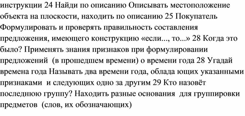 2 Найди предмет Находить предмет в пространстве, на плоскости по его описанию 6 Угадай по описанию Называть существенные свойства известных объектов 6 Сколько стоит? Ориентироваться в таблице 7 Что изменилось? Сравнивать объекты, называть изменившийся признак 12 Слушай и складывай Следовать инструкции 24 Найди по описанию Описывать местоположение объекта на плоскости, находить по описанию 25 Покупатель Формулировать и проверять правильность составления предложения, имеющего конструкцию «если..., то...» 28 Когда это было? Применять знания признаков при формулировании предложений (в прошедшем времени) о времени года 28 Угадай времена года Называть два времени года, облада ющих указанными признаками и следующих одно за другим 29 Кто назовёт последнюю группу? Находить разные основания для группировки предметов (слов, их обозначающих)