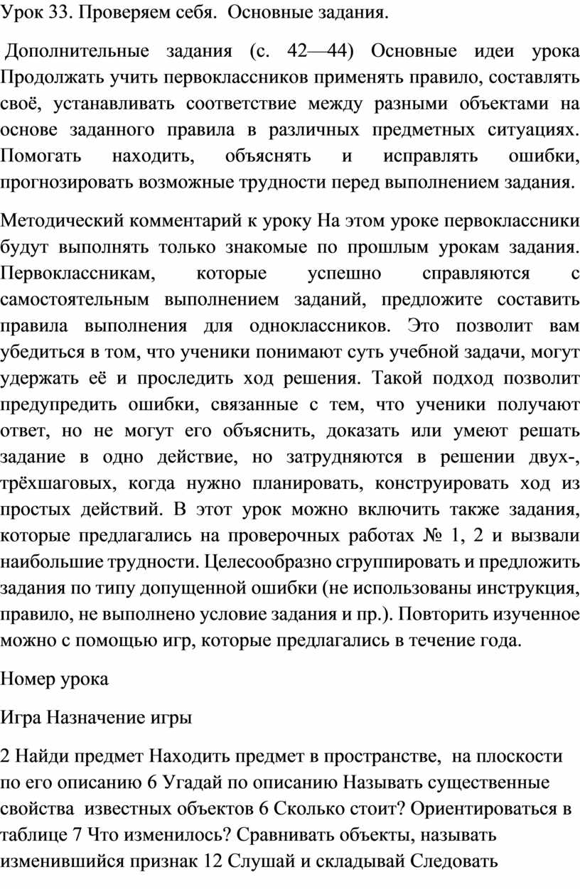 Методический комментарий к уроку На этом уроке первоклассники будут выполнять только знакомые по прошлым урокам задания. Первоклассникам, которые успешно справляются с самостоятельным выполнением заданий, предложите составить правила выполнения для одноклассников. Это позволит вам убедиться в том, что ученики понимают суть учебной задачи, могут удержать её и проследить ход решения. Такой подход позволит предупредить ошибки, связанные с тем, что ученики получают ответ, но не могут его объяснить, доказать или умеют решать задание в одно действие, но затрудняются в решении двух-, трёхшаговых, когда нужно планировать, конструировать ход из простых действий. В этот урок можно включить также задания, которые предлагались на проверочных работах № 1, 2 и вызвали наибольшие трудности. Целесообразно сгруппировать и предложить задания по типу допущенной ошибки (не использованы инструкция, правило, не выполнено условие задания и пр.). Повторить изученное можно с помощью игр, которые предлагались в течение года.