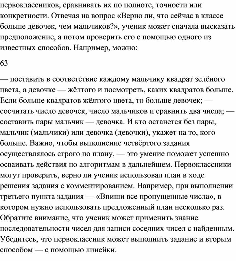 — поставить в соответствие каждому мальчику квадрат зелёного цвета, а девочке — жёлтого и посмотреть, каких квадратов больше. Если больше квадратов жёлтого цвета, то больше девочек; — сосчитать число девочек, число мальчиков и сравнить два числа; — составить пары мальчик — девочка. И кто останется без пары, мальчик (мальчики) или девочка (девочки), укажет на то, кого больше. Важно, чтобы выполнение четвёртого задания осуществлялось строго по плану, — это умение поможет успешно осваивать действия по алгоритмам в дальнейшем. Первоклассники могут проверить, верно ли ученик использовал план в ходе решения задания с комментированием. Например, при выполнении третьего пункта задания — «Впиши все пропущенные числа», в котором нужно использовать предложенный план несколько раз. Обратите внимание, что ученик может применить знание последовательности чисел для записи соседних чисел с найденным. Убедитесь, что первоклассник может выполнить задание и вторым способом — с помощью линейки.