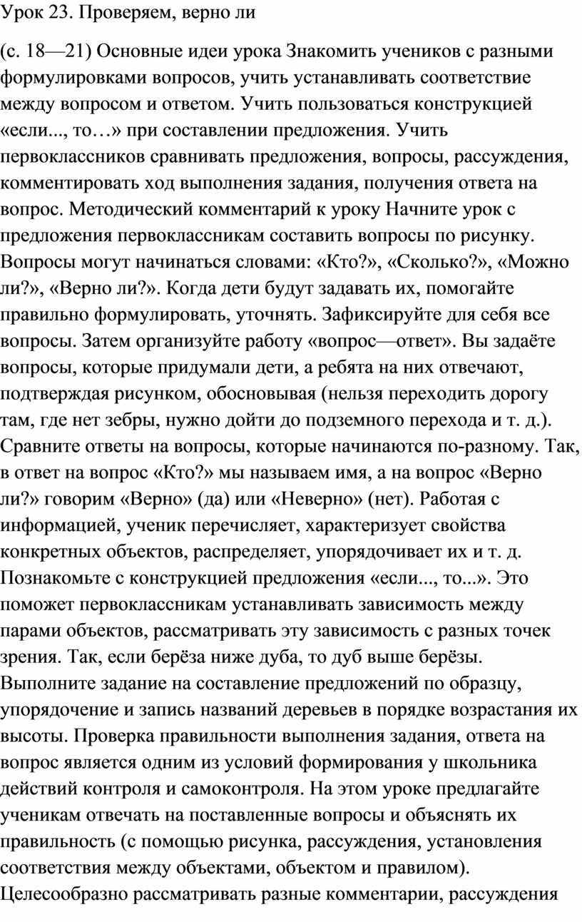 (с. 18—21) Основные идеи урока Знакомить учеников с разными формулировками вопросов, учить устанавливать соответствие между вопросом и ответом. Учить пользоваться конструкцией «если..., то…» при составлении предложения. Учить первоклассников сравнивать предложения, вопросы, рассуждения, комментировать ход выполнения задания, получения ответа на вопрос. Методический комментарий к уроку Начните урок с предложения первоклассникам составить вопросы по рисунку. Вопросы могут начинаться словами: «Кто?», «Сколько?», «Можно ли?», «Верно ли?». Когда дети будут задавать их, помогайте правильно формулировать, уточнять. Зафиксируйте для себя все вопросы. Затем организуйте работу «вопрос—ответ». Вы задаёте вопросы, которые придумали дети, а ребята на них отвечают, подтверждая рисунком, обосновывая (нельзя переходить дорогу там, где нет зебры, нужно дойти до подземного перехода и т. д.). Сравните ответы на вопросы, которые начинаются по-разному. Так, в ответ на вопрос «Кто?» мы называем имя, а на вопрос «Верно ли?» говорим «Верно» (да) или «Неверно» (нет). Работая с информацией, ученик перечисляет, характеризует свойства конкретных объектов, распределяет, упорядочивает их и т. д. Познакомьте с конструкцией предложения «если..., то...». Это поможет первоклассникам устанавливать зависимость между парами объектов, рассматривать эту зависимость с разных точек зрения. Так, если берёза ниже дуба, то дуб выше берёзы. Выполните задание на составление предложений по образцу, упорядочение и запись названий деревьев в порядке возрастания их высоты. Проверка правильности выполнения задания, ответа на вопрос является одним из условий формирования у школьника действий контроля и самоконтроля. На этом уроке предлагайте ученикам отвечать на поставленные вопросы и объяснять их правильность (с помощью рисунка, рассуждения, установления соответствия между объектами, объектом и правилом). Целесообразно рассматривать разные комментарии, рассуждения первоклассников, сравнивать их по полноте, точности или конкретности. Отвечая на вопрос «Верно ли, что сейчас в классе больше девочек, чем мальчиков?», ученик может сначала высказать предположение, а потом проверить его с помощью одного из известных способов. Например, можно: