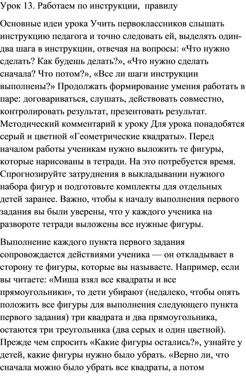 Основные идеи урока Учить первоклассников слышать инструкцию педагога и точно следовать ей, выделять один-два шага в инструкции, отвечая на вопросы: «Что нужно сделать? Как будешь делать?», «Что нужно сделать сначала? Что потом?», «Все ли шаги инструкции выполнены?» Продолжать формирование умения работать в паре: договариваться, слушать, действовать совместно, контролировать результат, презентовать результат. Методический комментарий к уроку Для урока понадобятся серый и цветной «Геометрические квадраты». Перед началом работы ученикам нужно выложить те фигуры, которые нарисованы в тетради. На это потребуется время. Спрогнозируйте затруднения в выкладывании нужного набора фигур и подготовьте комплекты для отдельных детей заранее. Важно, чтобы к началу выполнения первого задания вы были уверены, что у каждого ученика на развороте тетради выложены все нужные фигуры.