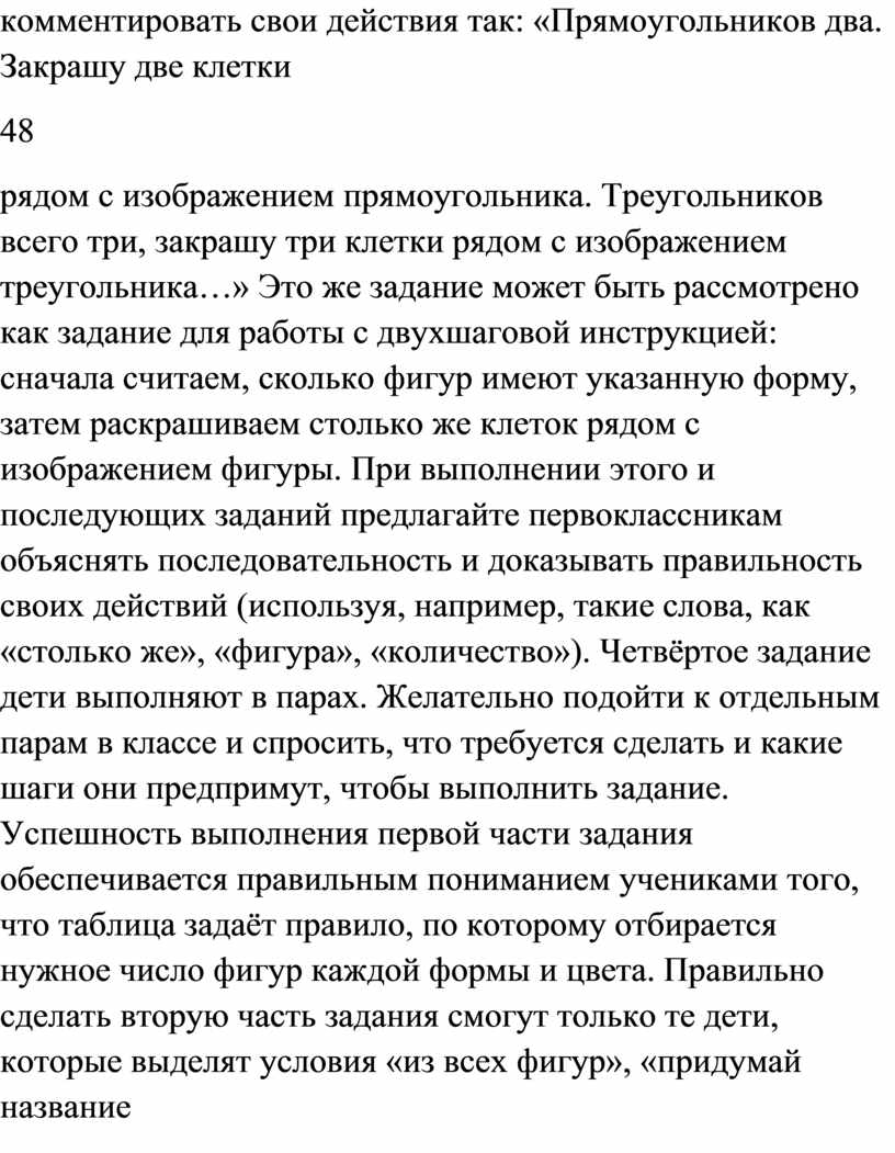 рядом с изображением прямоугольника. Треугольников всего три, закрашу три клетки рядом с изображением треугольника…» Это же задание может быть рассмотрено как задание для работы с двухшаговой инструкцией: сначала считаем, сколько фигур имеют указанную форму, затем раскрашиваем столько же клеток рядом с изображением фигуры. При выполнении этого и последующих заданий предлагайте первоклассникам объяснять последовательность и доказывать правильность своих действий (используя, например, такие слова, как «столько же», «фигура», «количество»). Четвёртое задание дети выполняют в парах. Желательно подойти к отдельным парам в классе и спросить, что требуется сделать и какие шаги они предпримут, чтобы выполнить задание. Успешность выполнения первой части задания обеспечивается правильным пониманием учениками того, что таблица задаёт правило, по которому отбирается нужное число фигур каждой формы и цвета. Правильно сделать вторую часть задания смогут только те дети, которые выделят условия «из всех фигур», «придумай название