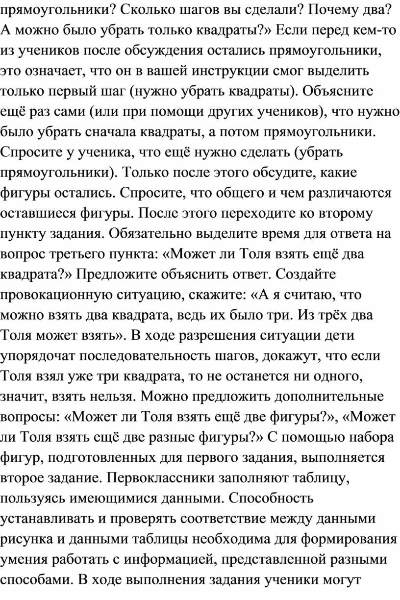 Выполнение каждого пункта первого задания сопровождается действиями ученика — он откладывает в сторону те фигуры, которые вы называете. Например, если вы читаете: «Миша взял все квадраты и все прямоугольники», то дети убирают (недалеко, чтобы опять положить все фигуры для выполнения следующего пункта первого задания) три квадрата и два прямоугольника, остаются три треугольника (два серых и один цветной). Прежде чем спросить «Какие фигуры остались?», узнайте у детей, какие фигуры нужно было убрать. «Верно ли, что сначала можно было убрать все квадраты, а потом прямоугольники? Сколько шагов вы сделали? Почему два? А можно было убрать только квадраты?» Если перед кем-то из учеников после обсуждения остались прямоугольники, это означает, что он в вашей инструкции смог выделить только первый шаг (нужно убрать квадраты). Объясните ещё раз сами (или при помощи других учеников), что нужно было убрать сначала квадраты, а потом прямоугольники. Спросите у ученика, что ещё нужно сделать (убрать прямоугольники). Только после этого обсудите, какие фигуры остались. Спросите, что общего и чем различаются оставшиеся фигуры. После этого переходите ко второму пункту задания. Обязательно выделите время для ответа на вопрос третьего пункта: «Может ли Толя взять ещё два квадрата?» Предложите объяснить ответ. Создайте провокационную ситуацию, скажите: «А я считаю, что можно взять два квадрата, ведь их было три. Из трёх два Толя может взять». В ходе разрешения ситуации дети упорядочат последовательность шагов, докажут, что если Толя взял уже три квадрата, то не останется ни одного, значит, взять нельзя. Можно предложить дополнительные вопросы: «Может ли Толя взять ещё две фигуры?», «Может ли Толя взять ещё две разные фигуры?» С помощью набора фигур, подготовленных для первого задания, выполняется второе задание. Первоклассники заполняют таблицу, пользуясь имеющимися данными. Способность устанавливать и проверять соответствие между данными рисунка и данными таблицы необходима для формирования умения работать с информацией, представленной разными способами. В ходе выполнения задания ученики могут комментировать свои действия так: «Прямоугольников два. Закрашу две клетки