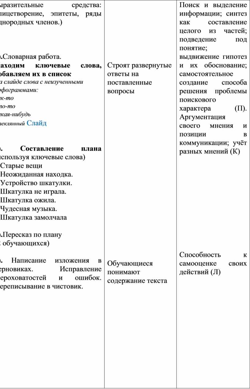 Поиск и выделение информации; синтез как составление целого из частей; подведение под понятие; выдвижение гипотез и их обоснование; самостоятельное создание способа решения проблемы поискового характера (П). Аргументация своего мнения и позиции в коммуникации; учёт разных мнений (К)