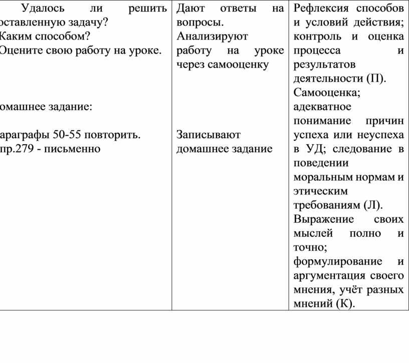Рефлексия способов и условий действия; контроль и оценка процесса и результатов деятельности (П). Самооценка; адекватное понимание причин успеха или неуспеха в УД; следование в поведении моральным нормам и этическим требованиям (Л). Выражение своих мыслей полно и точно; формулирование и аргументация своего мнения, учёт разных мнений (К). |