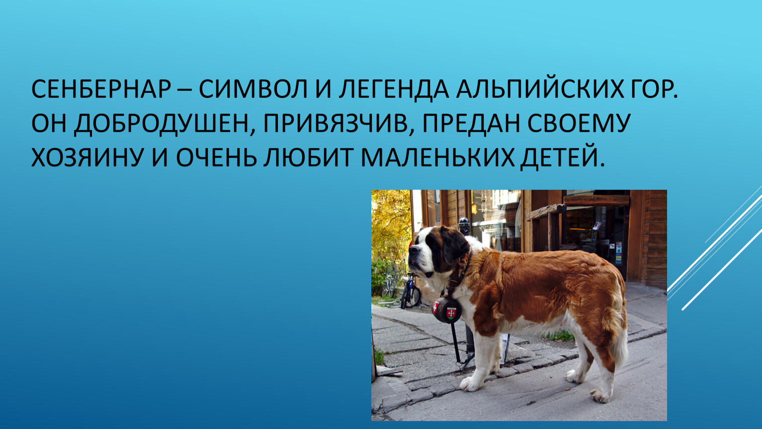 Сенбернар – символ и легенда альпийских гор. Он добродушен, привязчив, предан своему хозяину и очень любит маленьких детей.