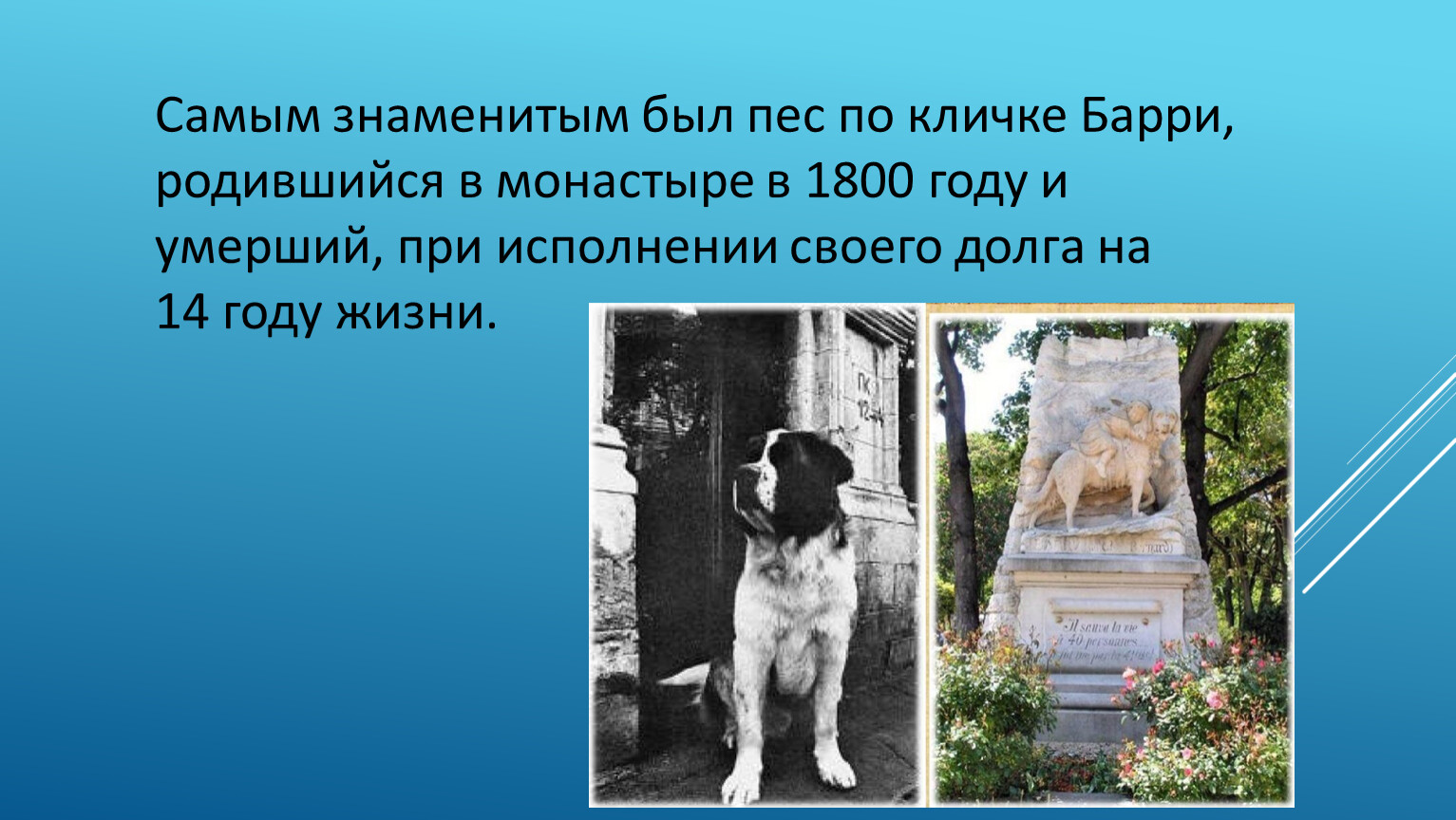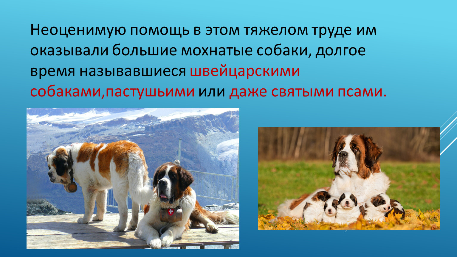 Неоценимую помощь в этом тяжелом труде им оказывали большие мохнатые собаки, долгое время называвшиеся швейцарскими собаками,пастушьими или даже святыми псами.