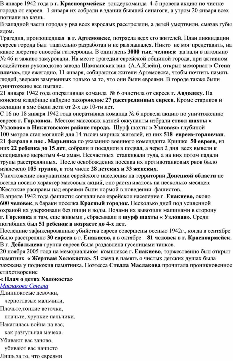 В начале декабря 1941г. всем евреям- мужчинам г. Макеевки было велено явиться в комендатуру с ценными вещами и одеждой. Затем их обыскивали, выводили за город и расстреливали. Таким же образом в лагере поселка Красная Горка было собрано свыше 500 еврейских женщин с малолетними детьми. Группами по 50-60 чел. их выводили за 3 километра к траншеям недалеко от аэродрома и там уничтожали. По приказу коменданта г. Макеевки Мюллера в феврале 1942 года был создан приют » Призрение» для детей от 6 месяцев до 14 лет, потерявших родителей.