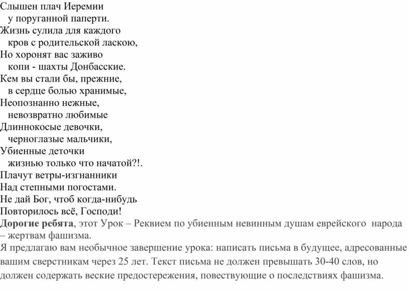 Дорогие ребята, этот Урок – Реквием по убиенным невинным душам еврейского народа – жертвам фашизма.